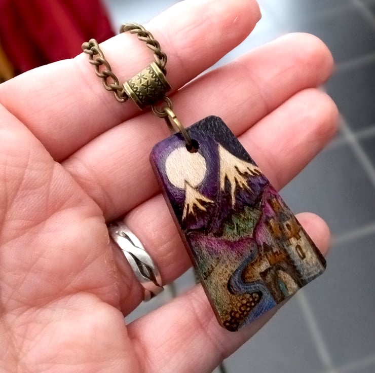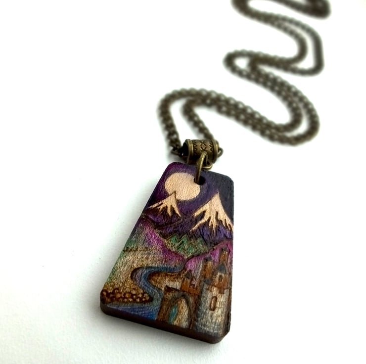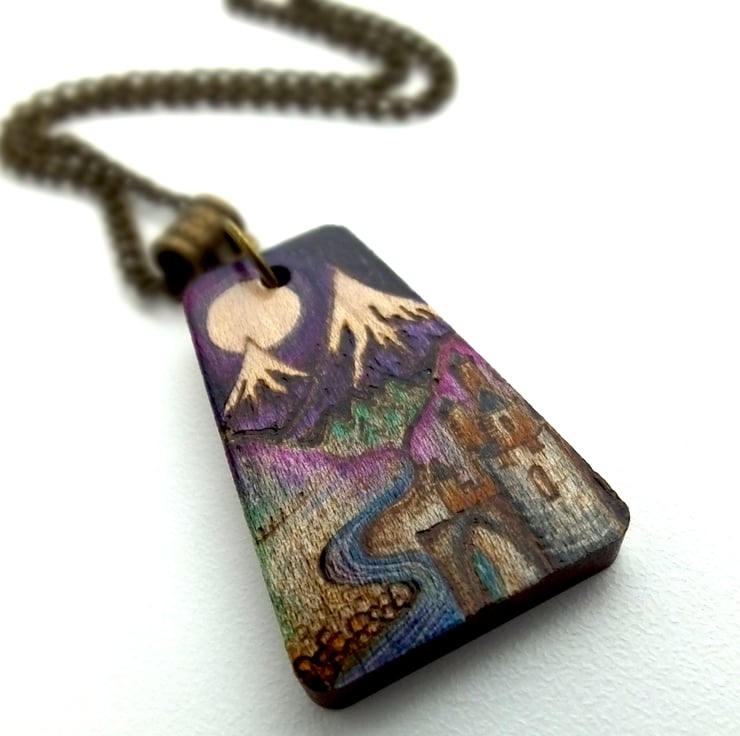 This listing is for a beautiful castle and mountain scene pendant, with a flowing river, heather and snow created using pyrography and inks.