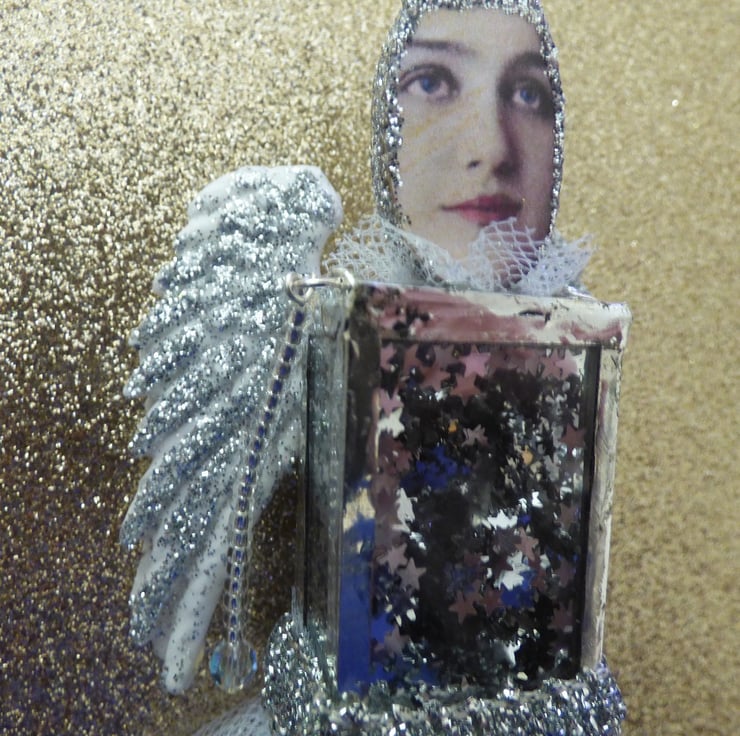 I have added a wooden, glittered bead for her head with an image of a beautiful vintage lady on. Ive also added a crown and a sparkling net skirt. Her animated legs and arms are made from headpins covered in seed beads. At the top I have added a loop so she can be easily hung up.