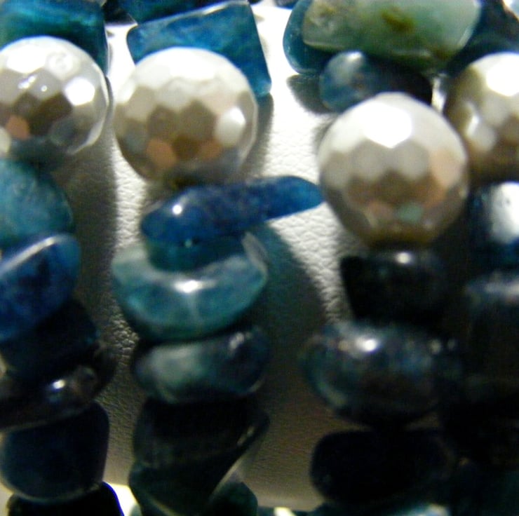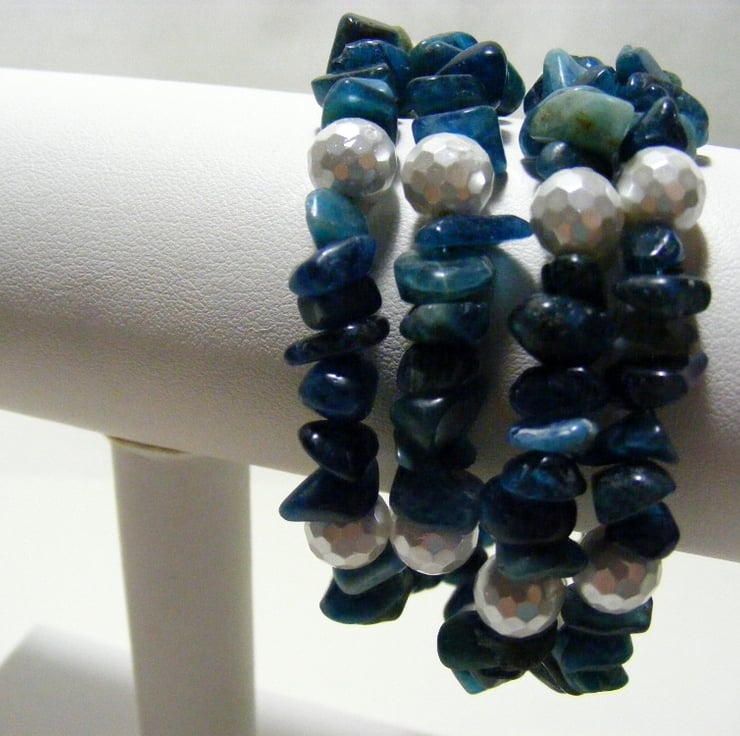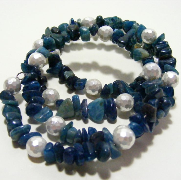 I have made this one of a kind semi precious gemstone bracelet by threading blue appitite nuggets and 8 mm white faceted south sea shell pearls onto bracelet memory wire. Ends of the memory wire are coiled.