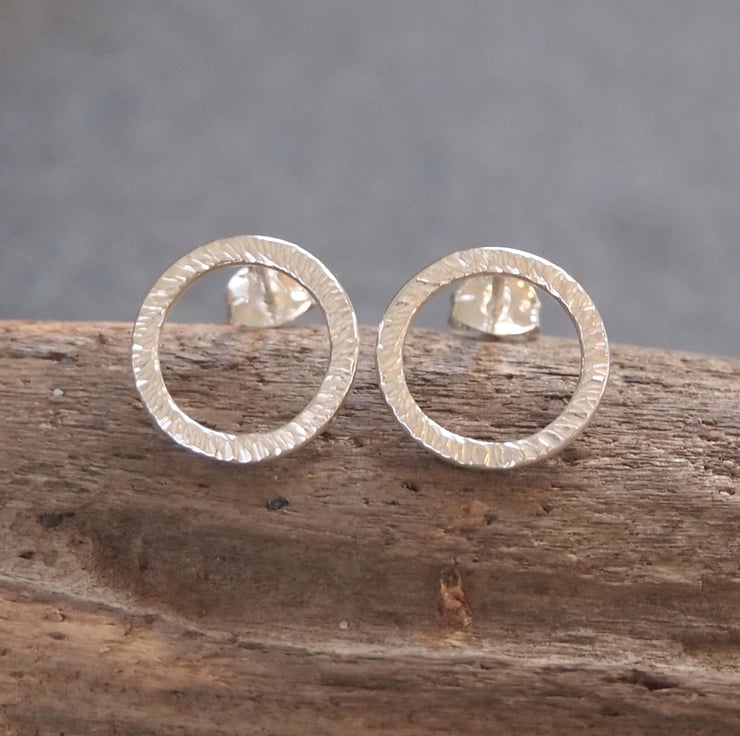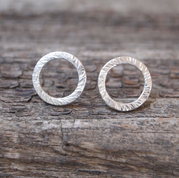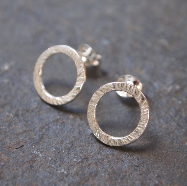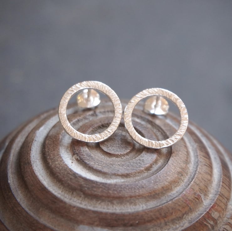 Sterling silver stud earrings, round studs with hammered texture. Unisex earrings ideal for everyday wear.