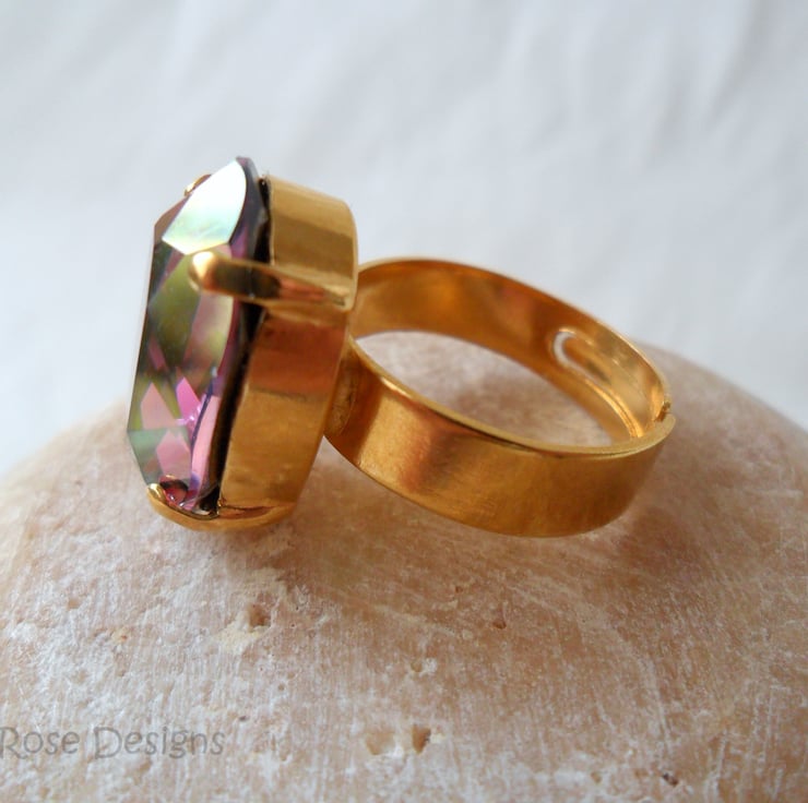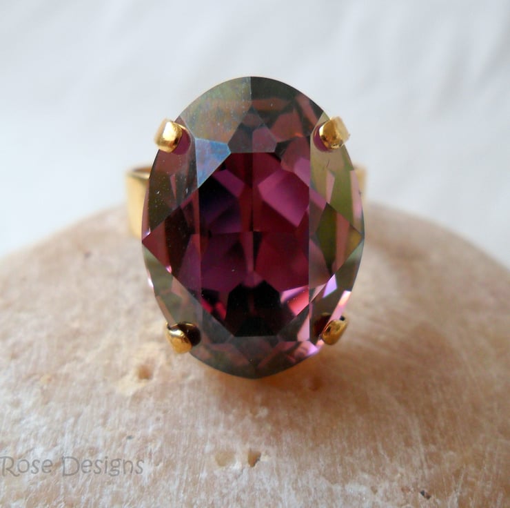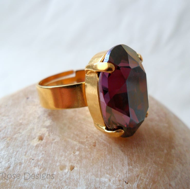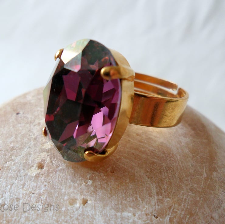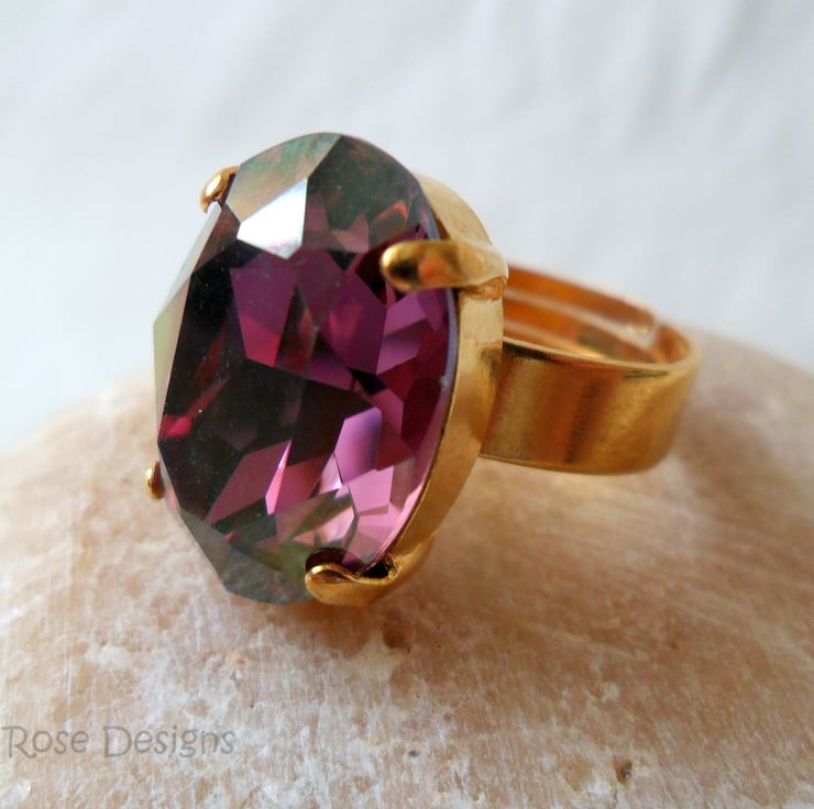 A real party ring! The large oval Swarovski crystal is set in an adjustable gold-plated wide ring band, so there are no problems with ring sizes. The amethyst crystal measures 20mm x 12mm and has a wonderful clarity and sparkle.