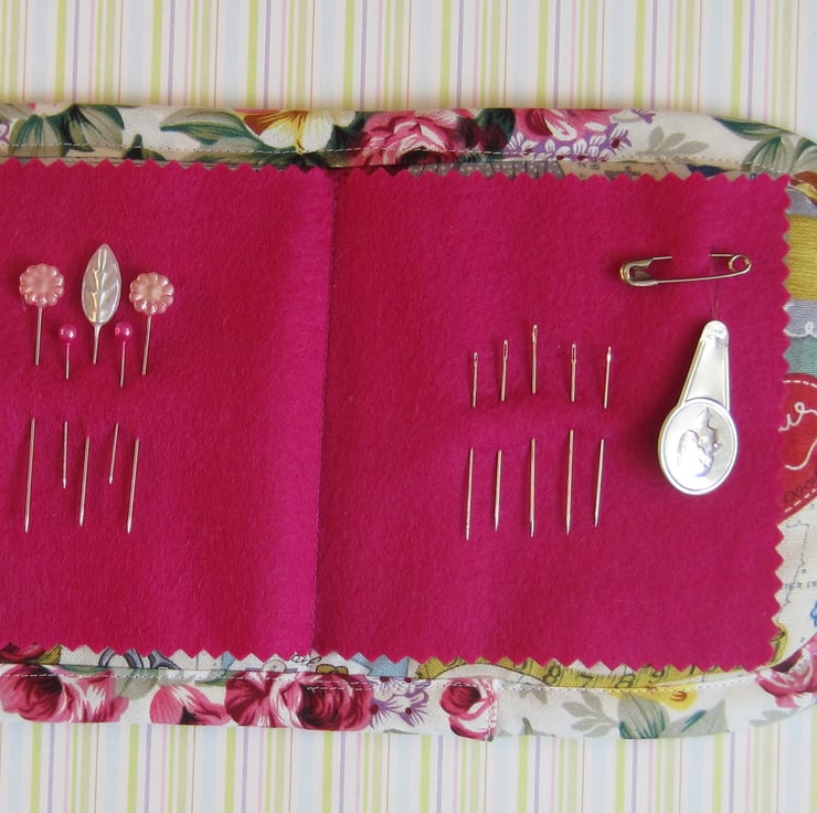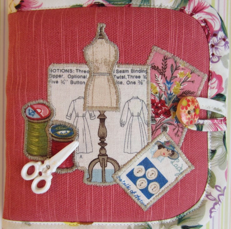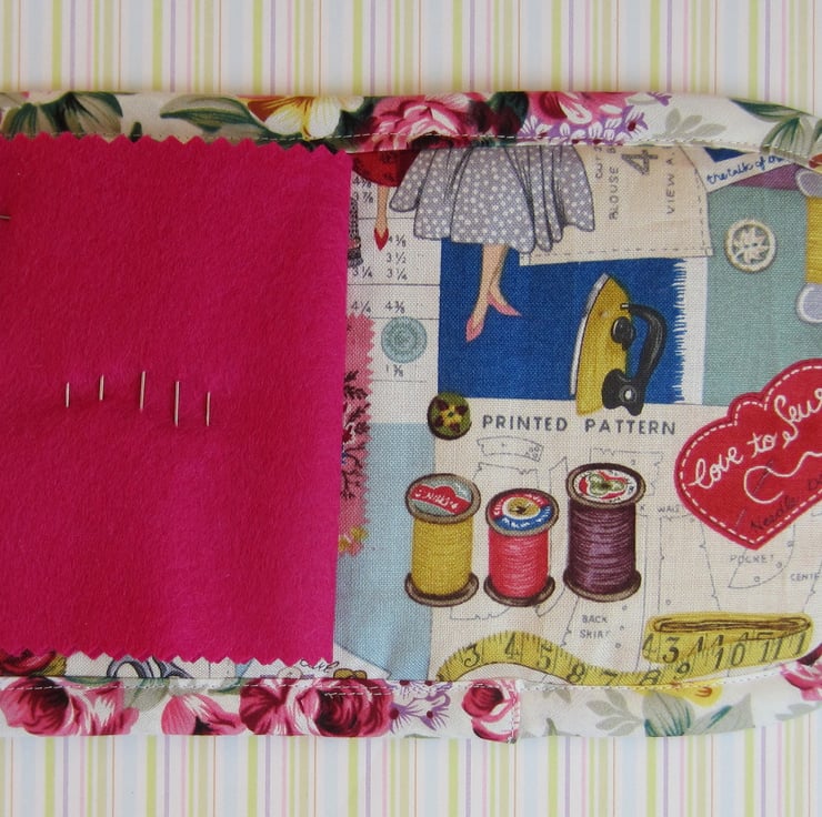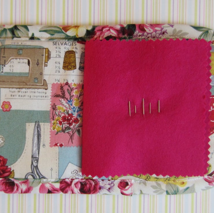 Lightly padded coral pink needle case with appliqued sewing items decoration and scissors button. Edged with a chintzy floral bias binding and backed with a matching sewing items fabric. Inside there is a dark pink felt page complete with pins, needles and a threader.