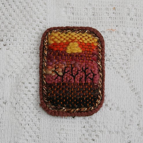 Inspired by a photograph of a sunset over the Clwydian Hills, this miniature woven tapestry is a unique piece of textile art.