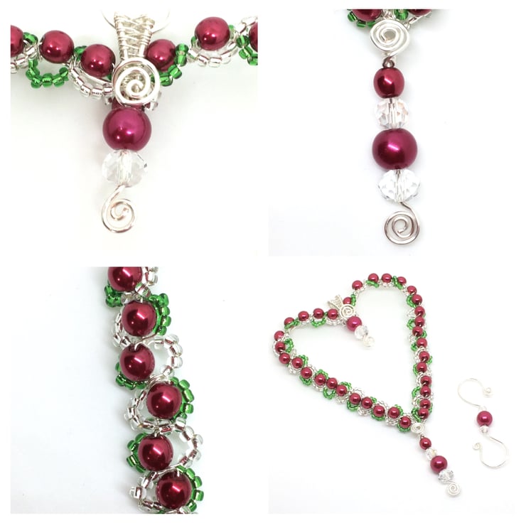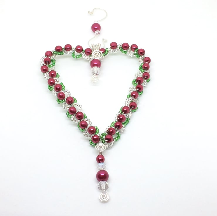 I have created the heart with wire wrapping and weaving techniques using silver plated wire. Beautiful berry red glass pearl beads, silver lined crystal and green seed beads have been wrapped around the heart with fine silver plated wire. A dangle drop from the bottom of the heart is made with glass pearls and Czech crystals. The heart is finished with a handcrafted decorative hook with pearl and crystal detail.