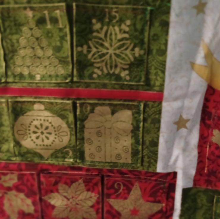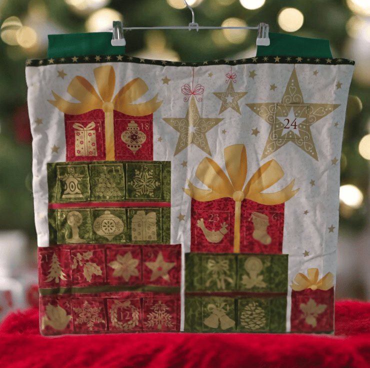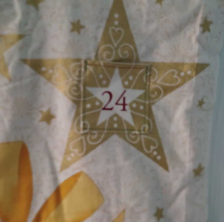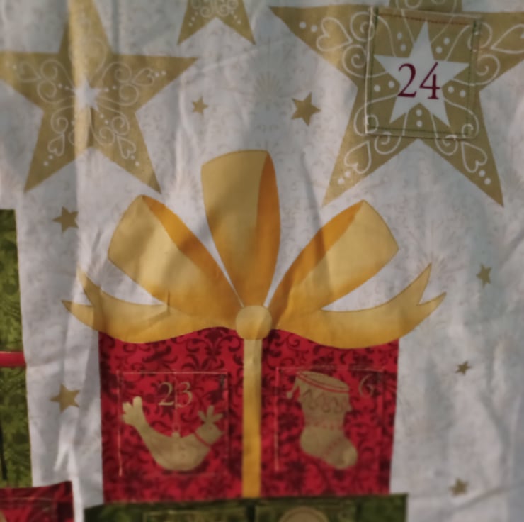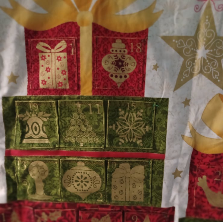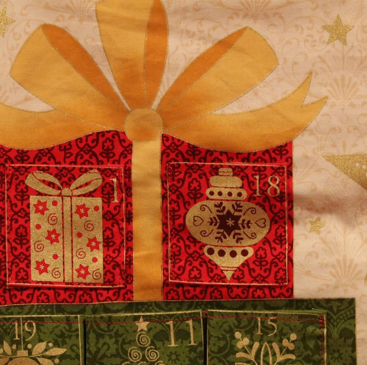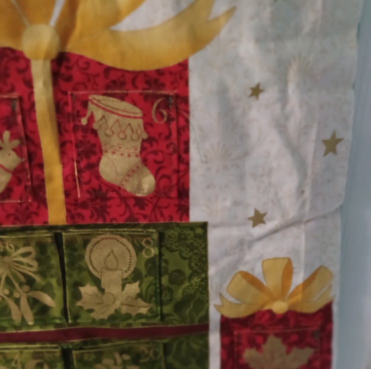 A fabric advent calendar with individual pockets for each day of advent. This is great for using again and again and can be filled with anything you like. The calendar shows two large presents with small pockets that are decorated in traditional Christmas pictures in a beautiful gold colour. The calendar is backed with Christmas fabric and has wadding in between to increase stability. There are two ribbon loops which can be used to hang the calendar. The benefits of this calendar are that it doesn't have the plastic trays that you find in the shop bought ones and can form part of your family tradition to be passed down the generations.