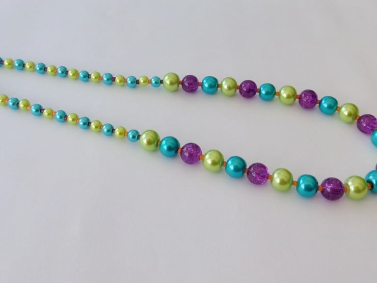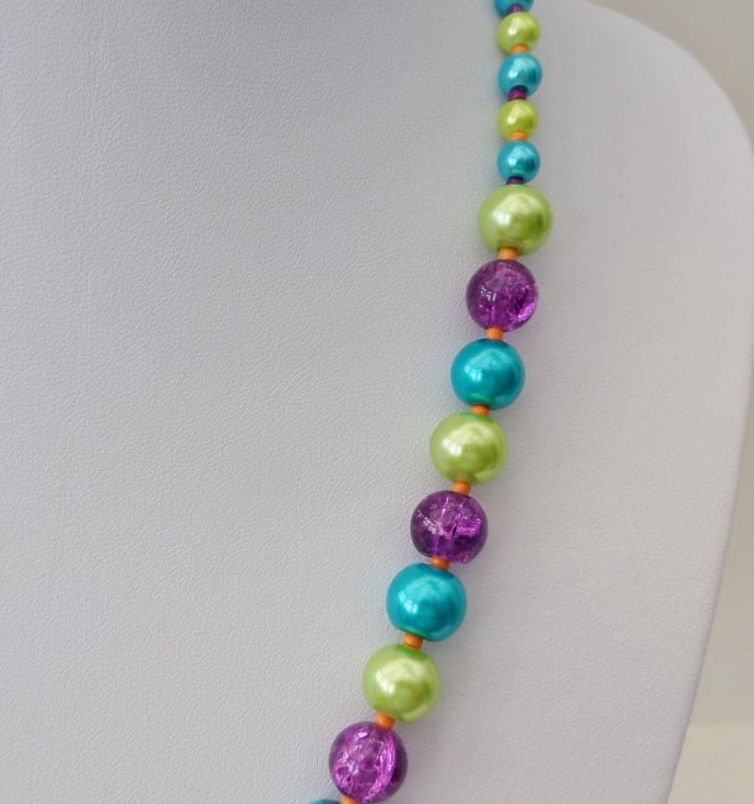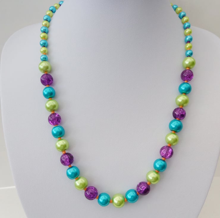 Necklace made using 8mm and 10mm lime green and turquoise glass pearls and 10mm purple crackle beads with seed beads in purple and orange. Necklace measures approx 20 inches and fastens with a silver coloured lobster clasp.