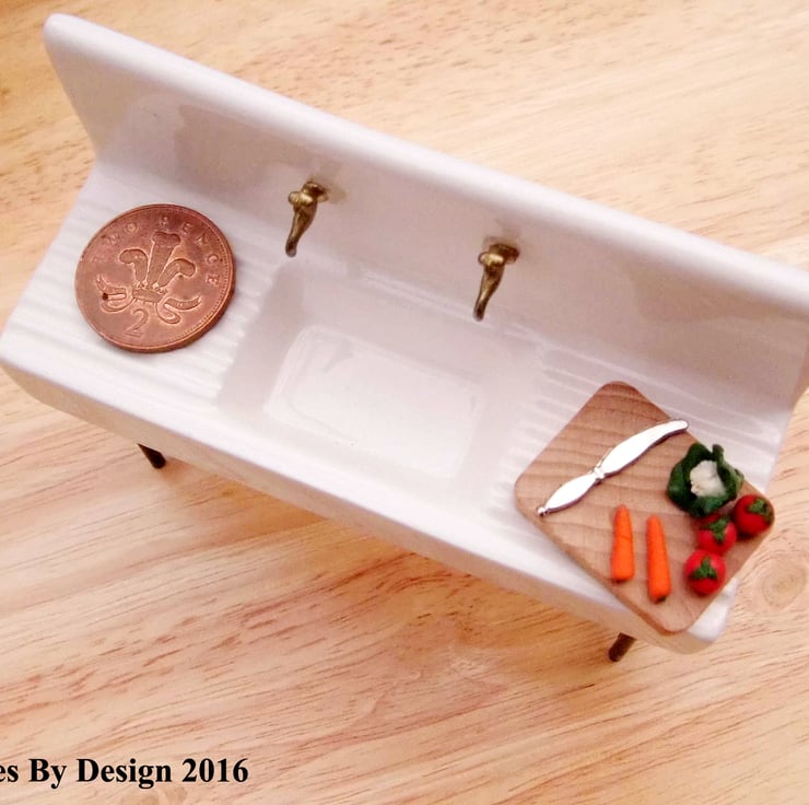 The vegetables have been handcrafted from polymer clay and affixed to a wooden chopping board. To finish off the set a metal knife has been attached so that your dolls can start chopping up that veg straight away.