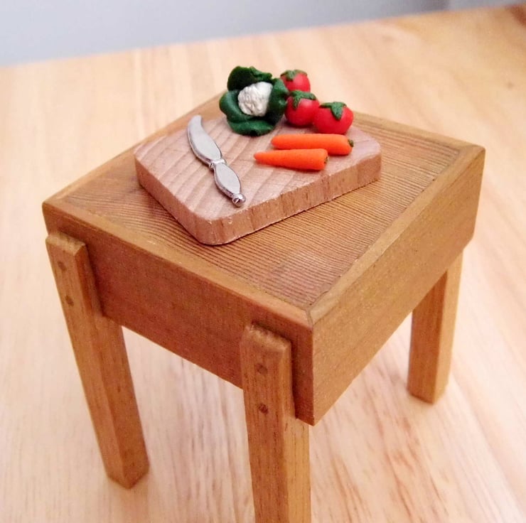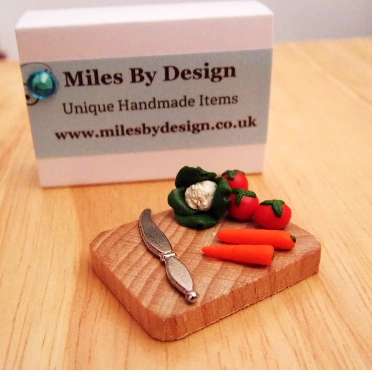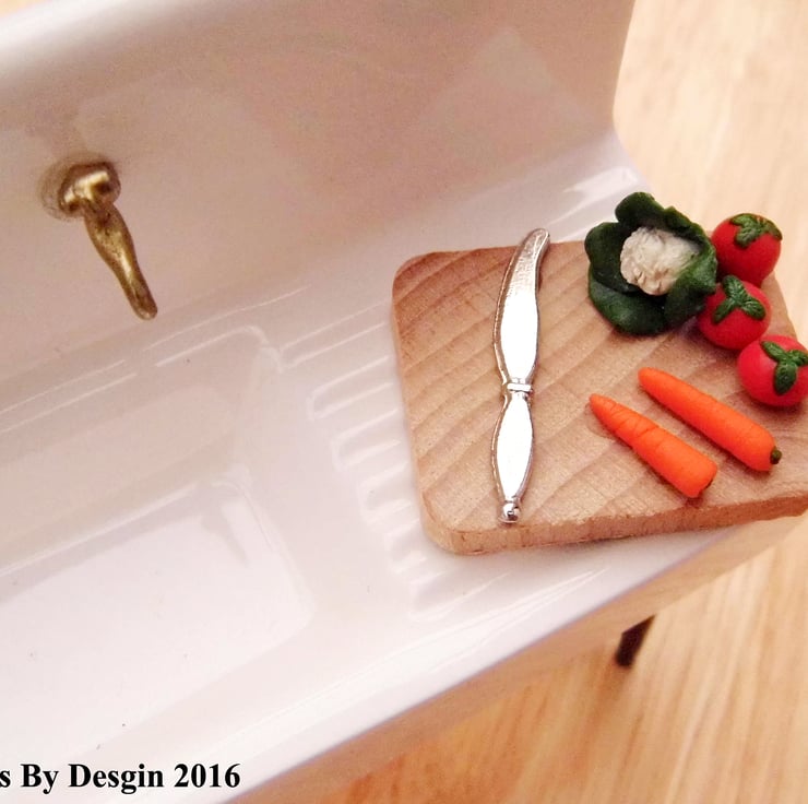 Your dolls house can make a start on preparing their Sunday roast with this vegetable chopping board complete with cauliflower, two carrots and three tomatoes.