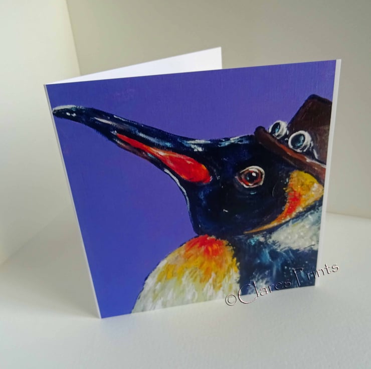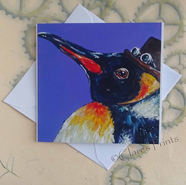 Blank greeting card from my original Acrylic painting Steampunk King Penguin