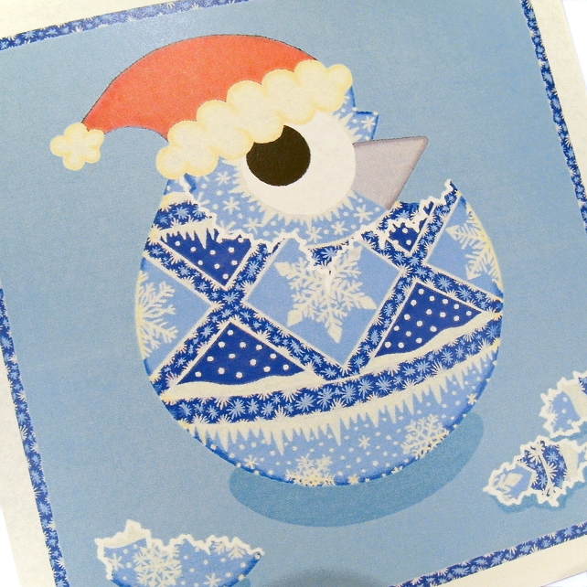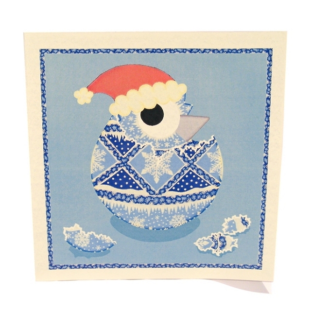 A cute little chick in a santa hat is hatching from a blue and white pysanka (a traditional Ukrainian decorated egg). The egg is decorated with snowflake patterns and the chick has taken on the same design as the egg.