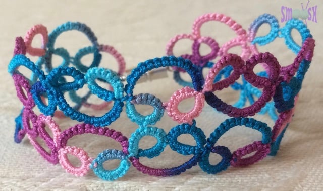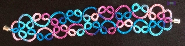 A delicate lace bracelet in shades of pink and blue. It is made from silky, Egyptian cotton thread.