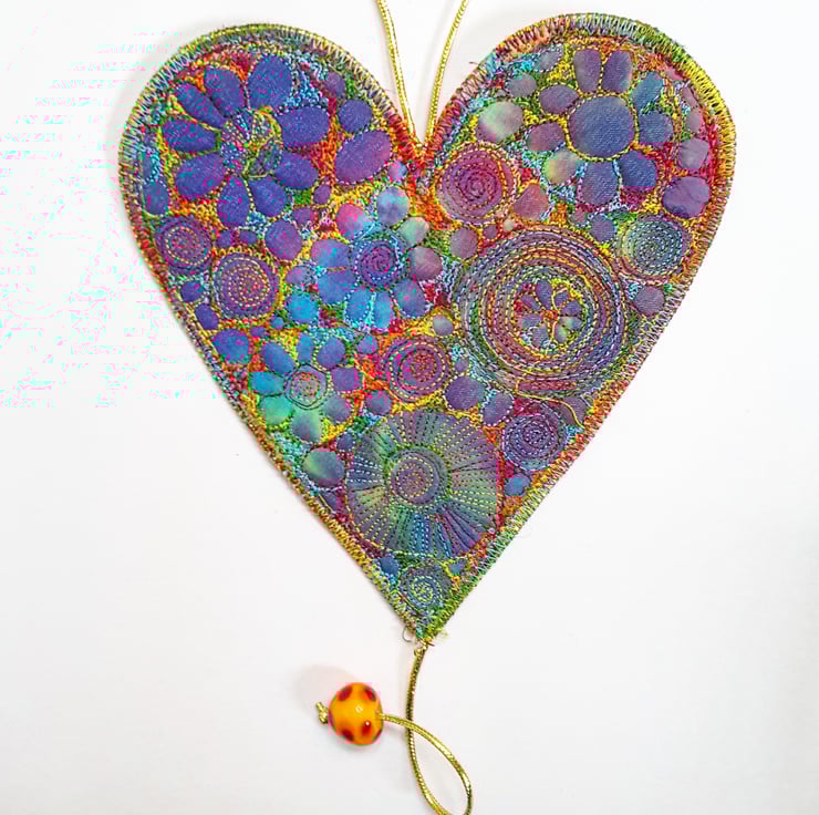 It has a gold hanging loop and a gold thread with one of my own handmade glass lampworked beads hanging from the bottom
