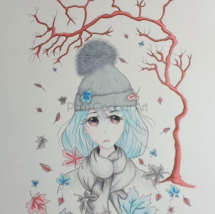 This Manga style art has been created on Daler Rowney cartridge paper. I have used Derwent colouring pencils and a Derwent fine liner pen in grey.