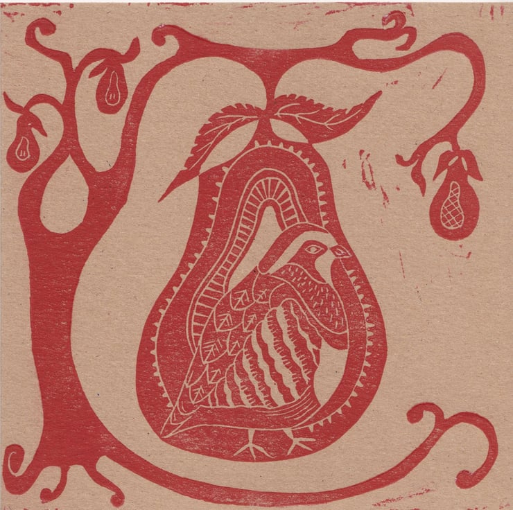 x3 HANDPRINTED CHRISTMAS CARDS - Partridge in a pear tree - red