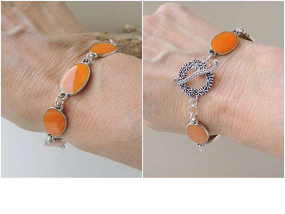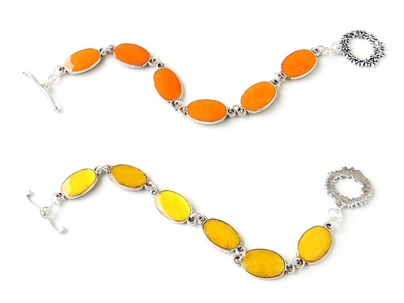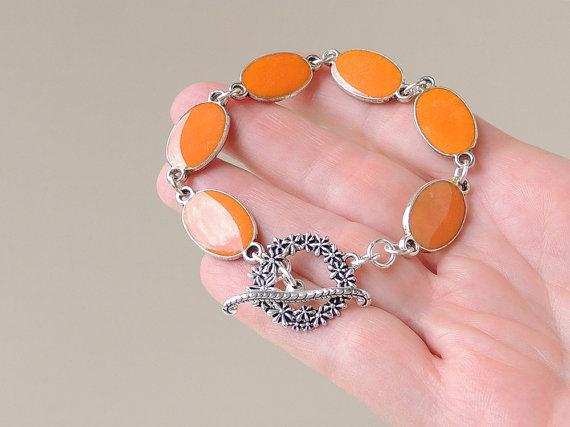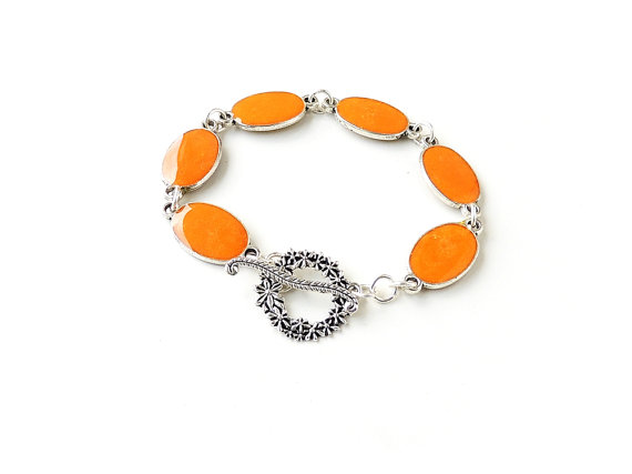 I made this bracelet by filling six antique silver plated bracelet bezels with orange resin. The bezels have been linked together and finished with an antique silver plated toggle clasp.