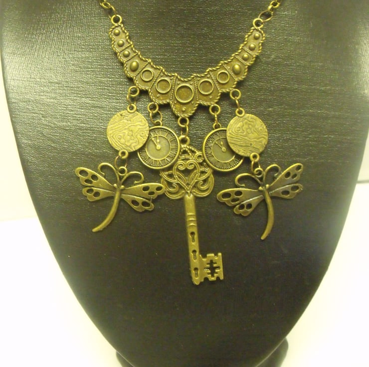 This is a necklace in antique bronze coloured metal. A Chain with a lobster class closing suspends a decorative hanger from which drops five charms - a key, two dragonflies with discs and two clock faces. Length from clasp to bottom of key is 31cm.
