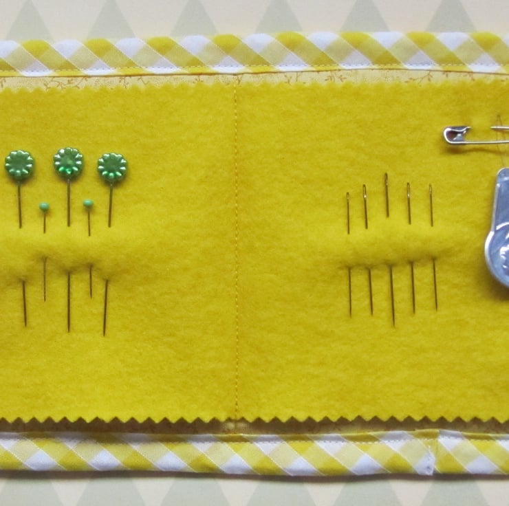 Inside there is a yellow felt page complete with pins, needles and a threader.