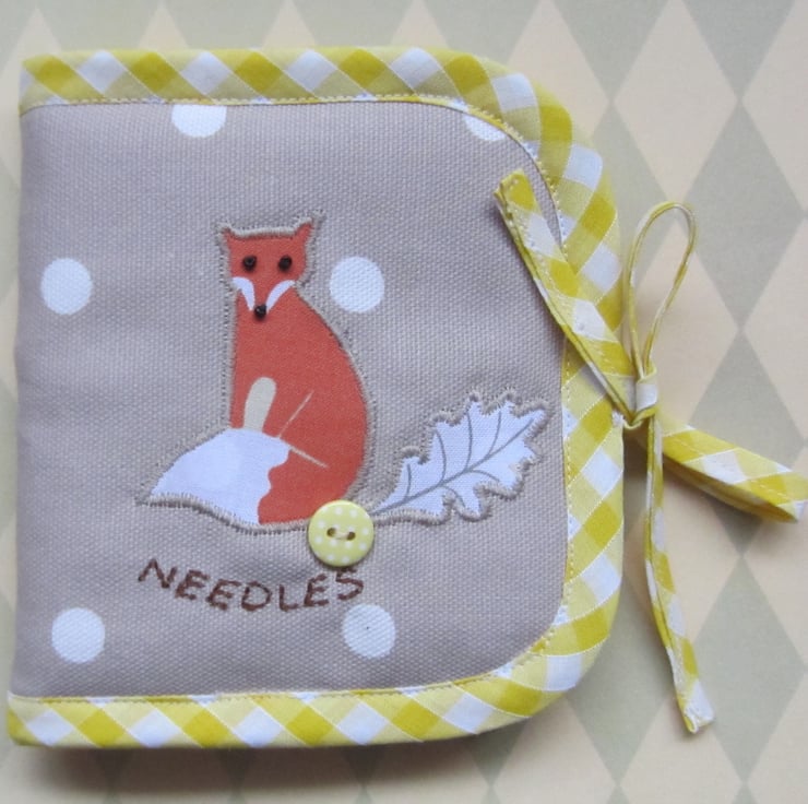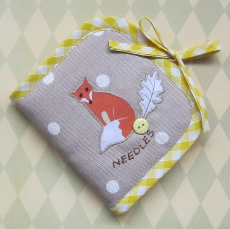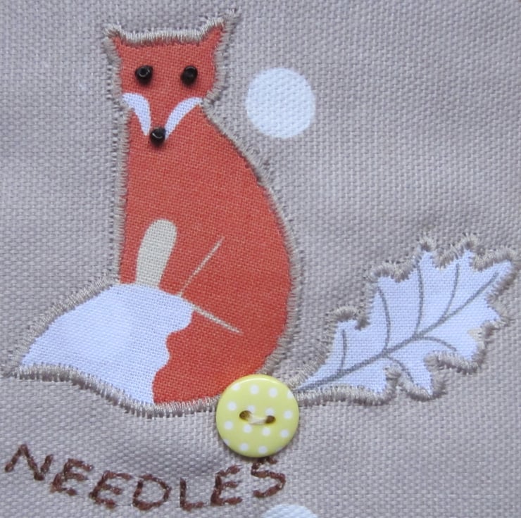 Lightly padded taupe and white spot needle case with appliqued fox and leaf decoration. Fox has black bead eyes and nose and there is an added yellow and white spotty button.