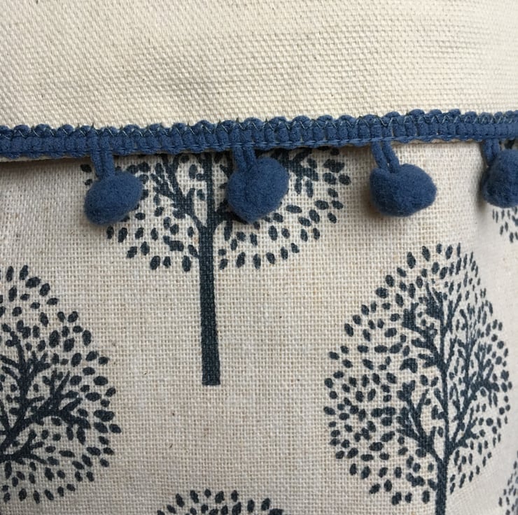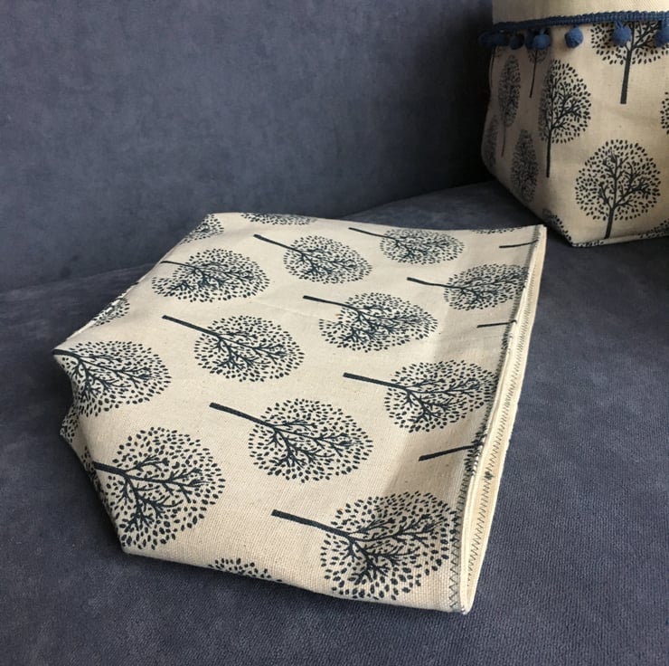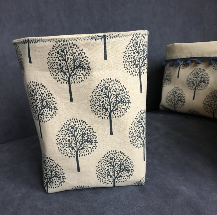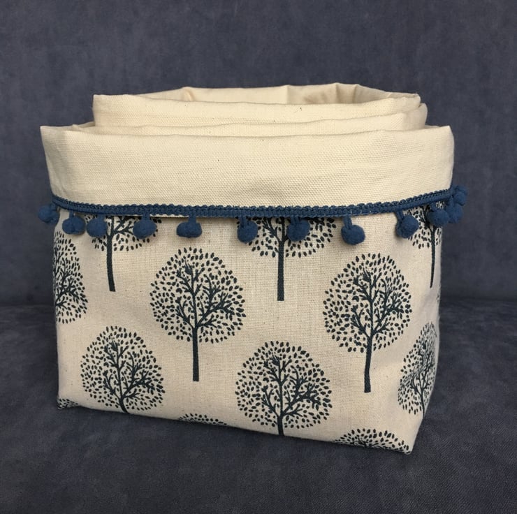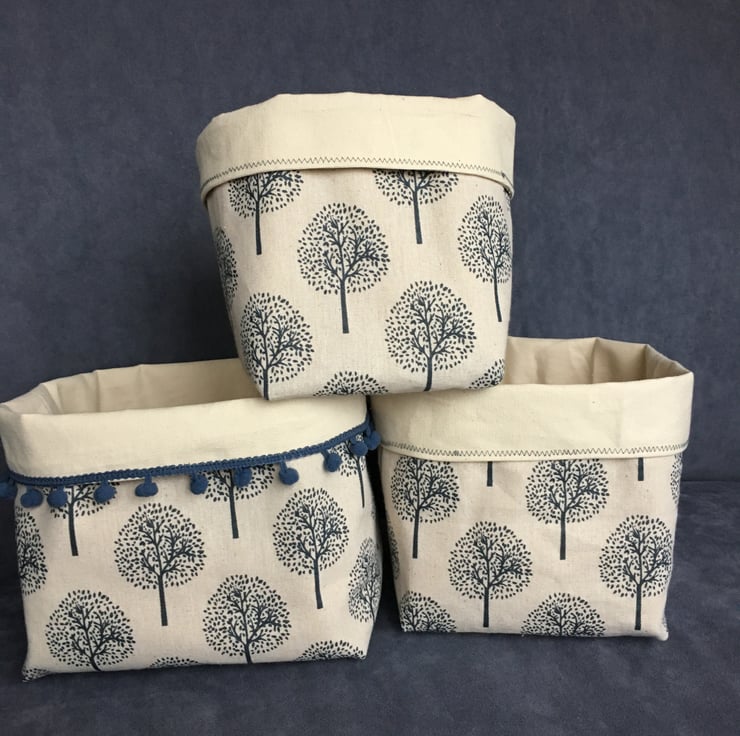 The biggest bin is edged in a dark blue bobble-trim. All of the baskets can be used with or without a turn-down top. They look good on a shelf, but are also very handy for organising bits and pieces in a drawer as the depth can vary depending on the depth of the turn-down.