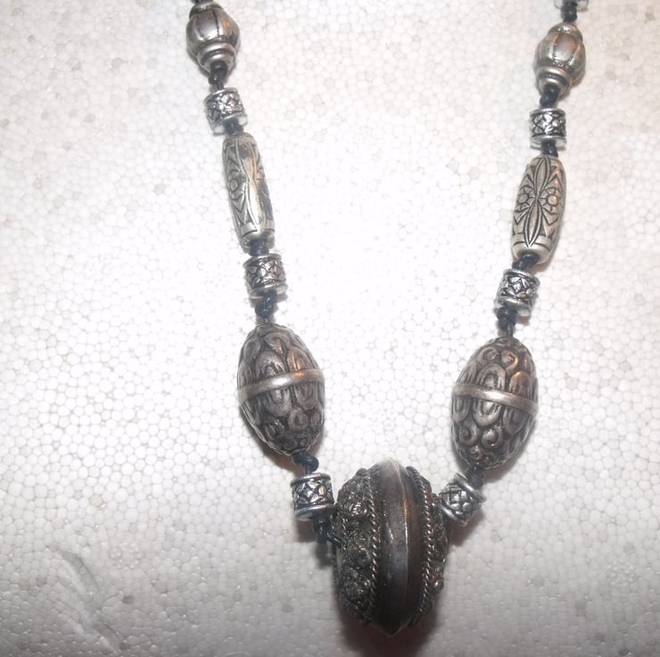 Here we have a necklace of chunky antique silver coloured beads hung on a black leather thong. It is finished with a hoop and toggle fastening and is approx 60cm long including the fastening. The largest bead has a diameter of 3.5cm