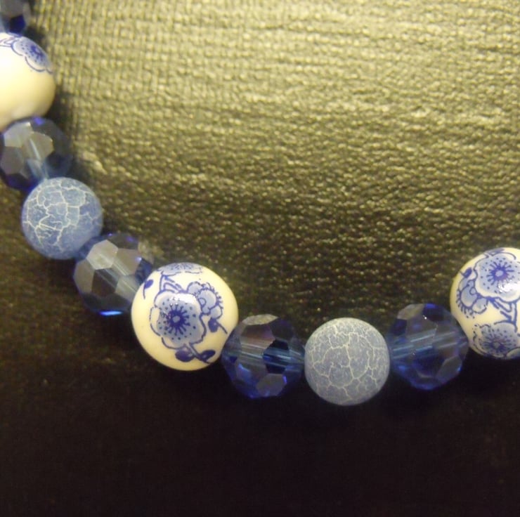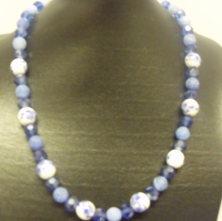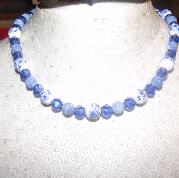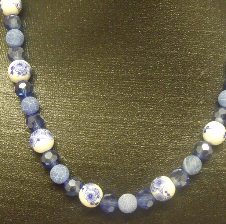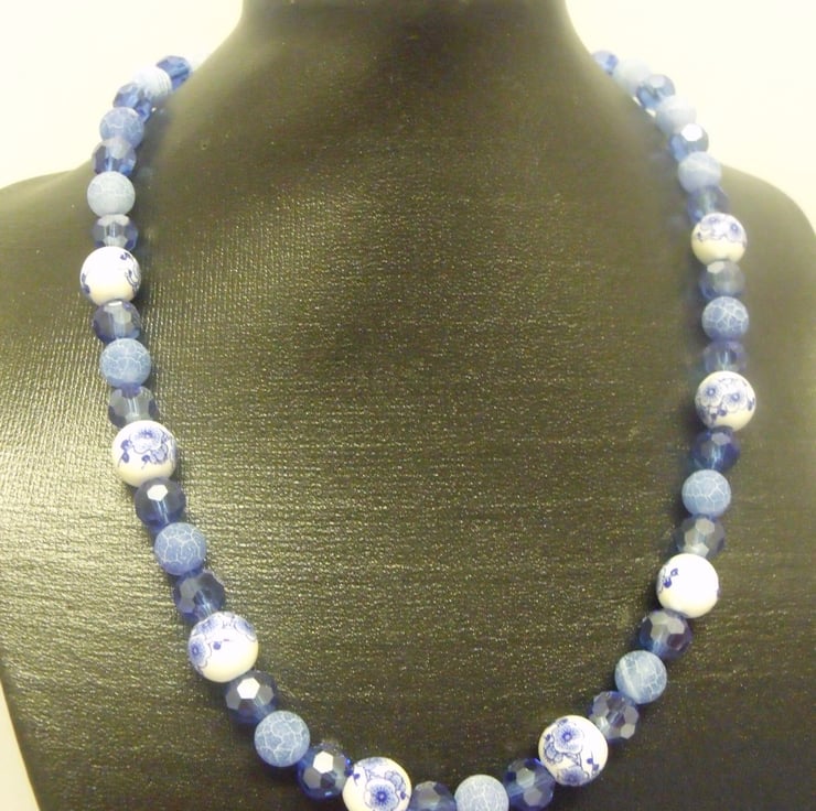 This necklace has white ceramic beads with blue flowers, crystal cut blue acrylic beads and frosted blue beads. It is finished with a silver coloured lobster clasp and split ring. It is 43cm long including the clasp and the beads are 4 and 6mm diameter.