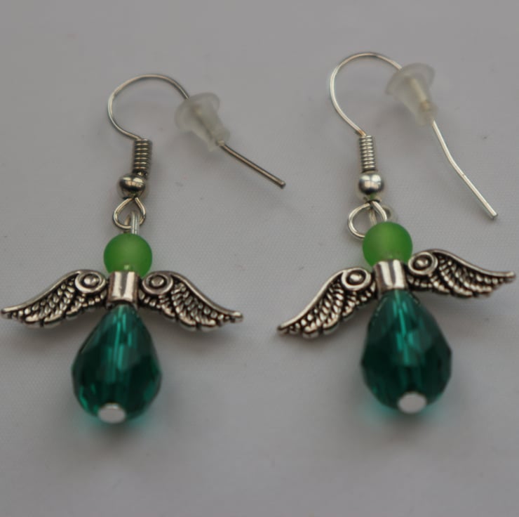 A pair of silver plated earrings in an angel design. Made from silver plated findings and glass beads. The beads are frosted green with drop bead in teal.