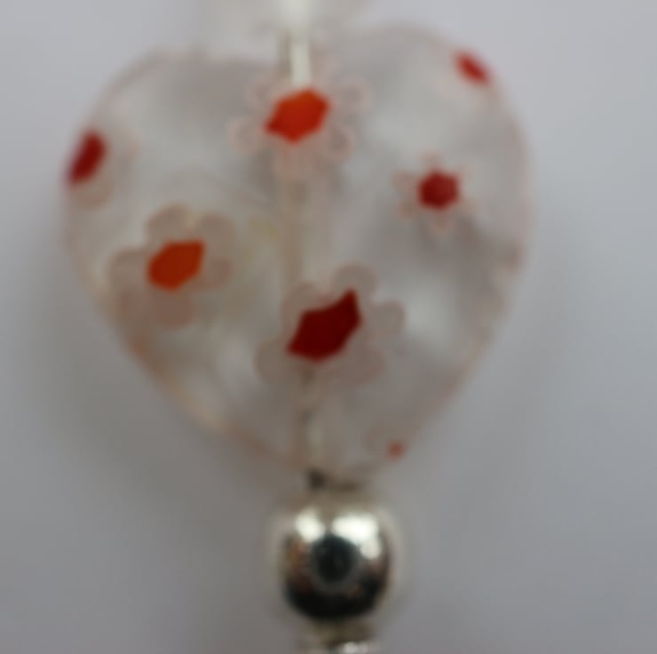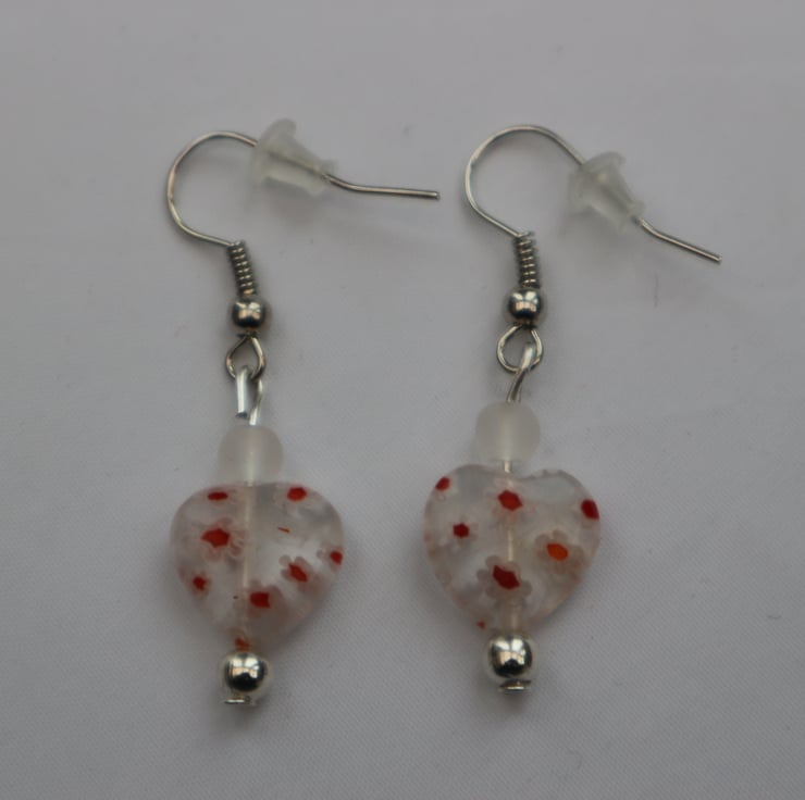 A pair of silver plated earrings in a millefiori heart design. Made from silver plated findings and glass beads. The beads are a frosted white bead with millefiori heart bead in red, white and clear.
