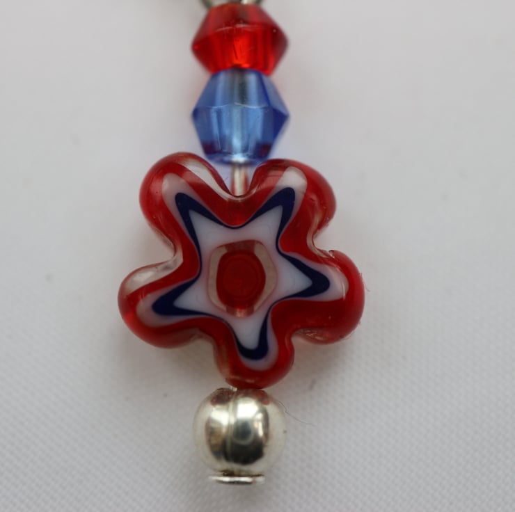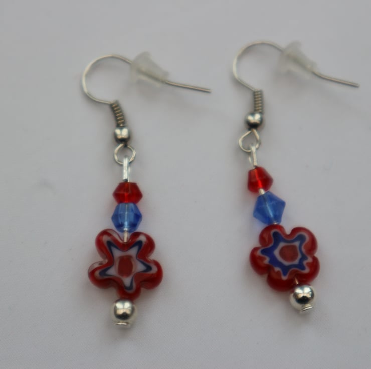 A pair of silver plated earrings in a millefiori flower design. Made from silver plated findings and glass beads. The beads are red and blue bicones with millefiori flower bead in red, blue and white.
