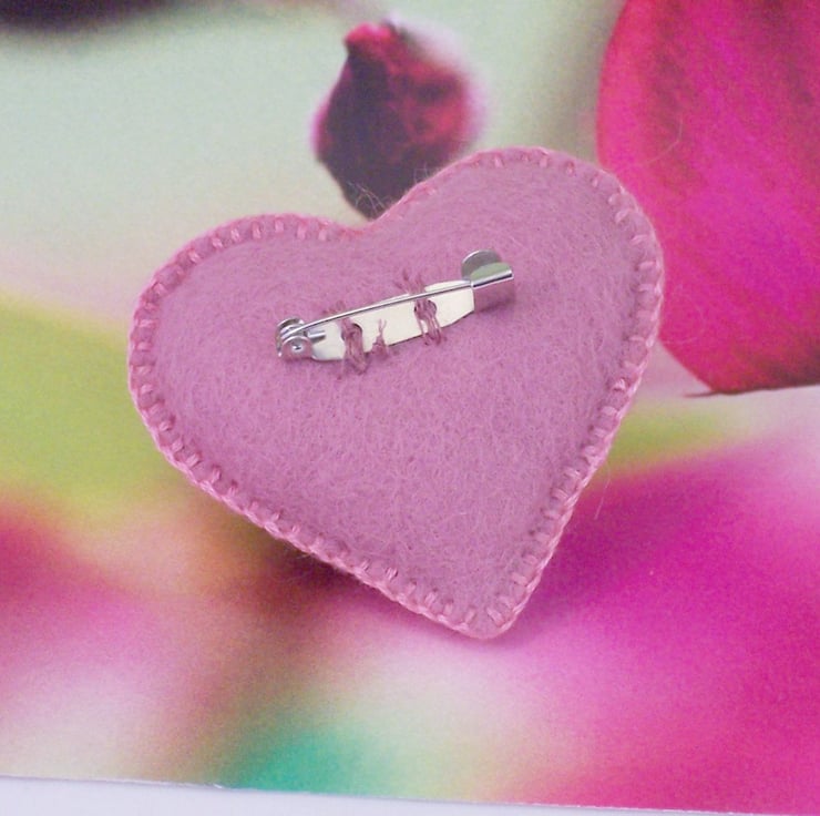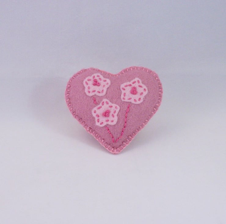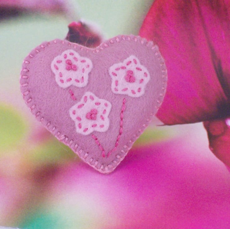 Bouquet heart shaped felt brooch with hand embroidery and silver coloured brooch pin on back.