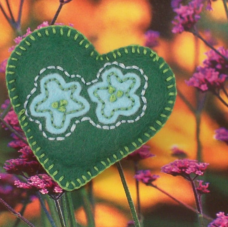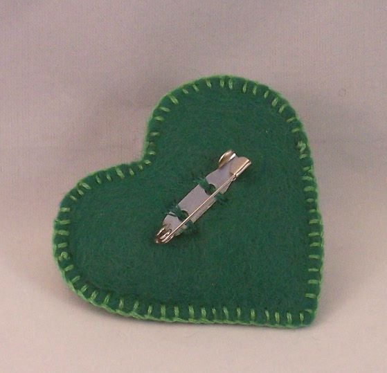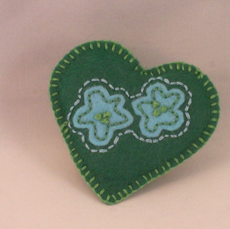 Heart shaped felt brooch with hand embroidery and silver coloured brooch pin on back.