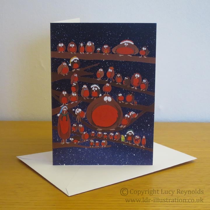 Greeting card featuring my 'Robins' illustration. I painted the original image with watercolours. The card is A6 size and supplied with a matching white envelope. Blank inside for your own message.