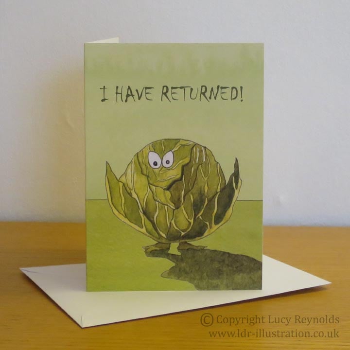 Greeting card featuring my 'Return of the Sprout' illustration. I painted the original image with watercolours.