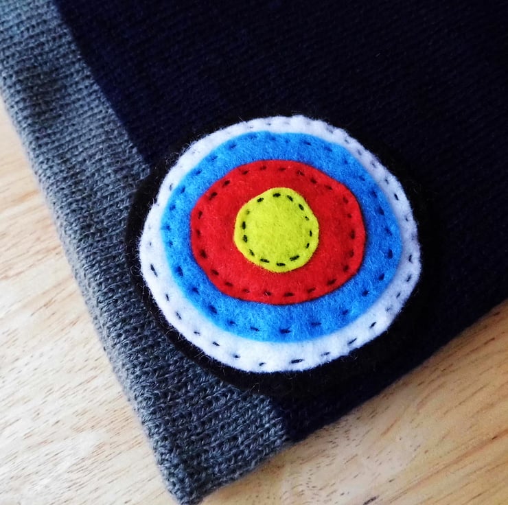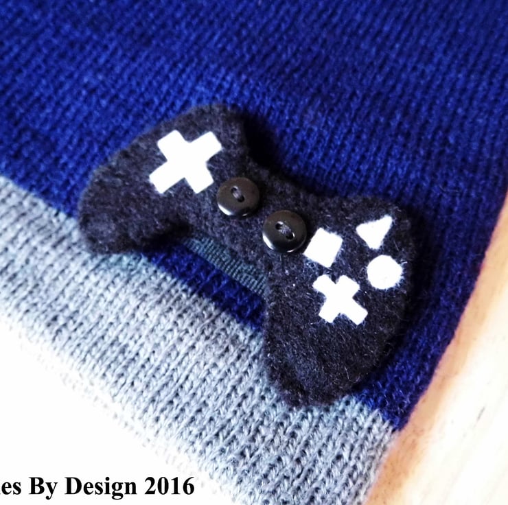 The motifs are a target and a gaming hand controller both of which are made from felt with velcro sewn onto the back.