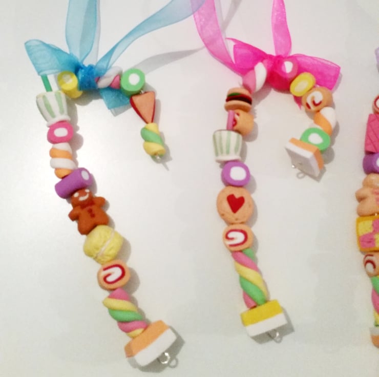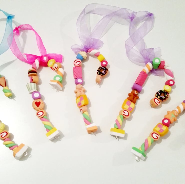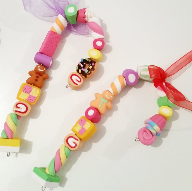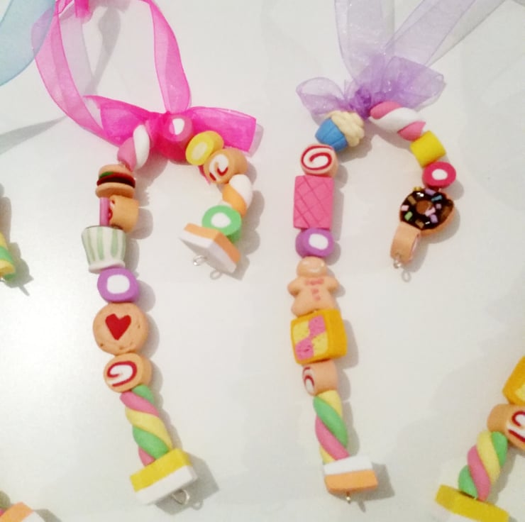 Charms are all made from polymer clay, with some additions of paint for extra detail. The decoration is finished off ready to hang using organza delicate ribbon.