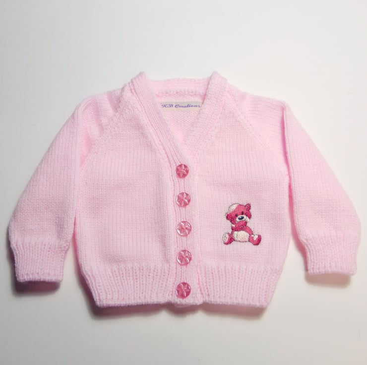 Lovely baby cardigan made in pink Yeoman Cashmillon 4 ply acrylic yarn, which is a lovely soft yarn, with a teddy bear motif on one side, embroidered in shades of pink.