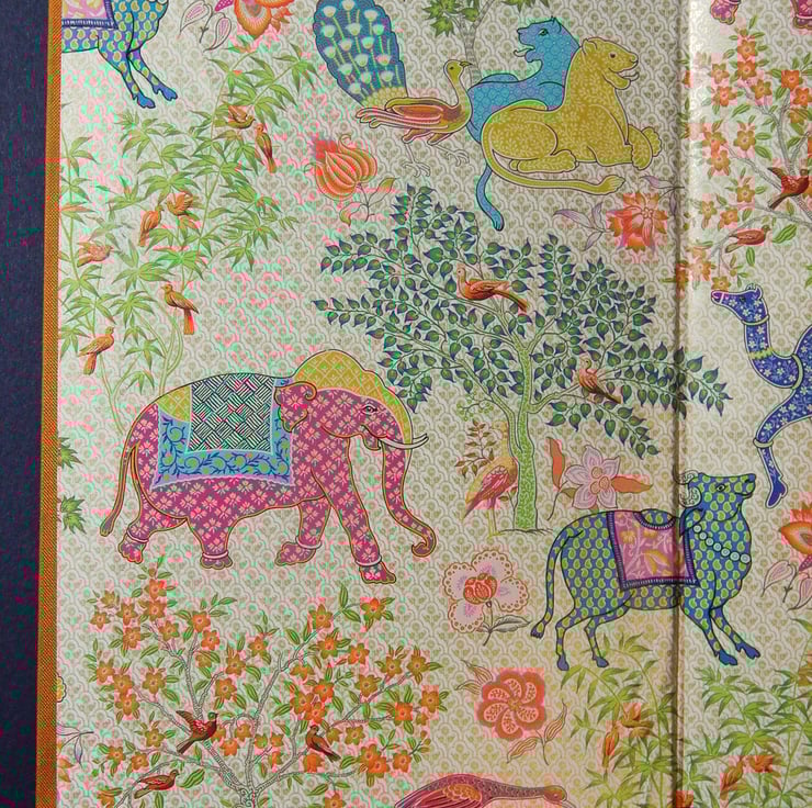The end-papers are of patterned paper - the same paper as the lions inset on the front cover. The design features lions, elephants, camels, ibis and peacocks, with trees and other plants, in a brightly coloured stylised design from C19th Persia.
