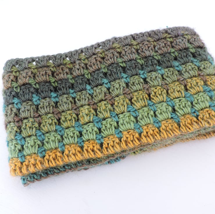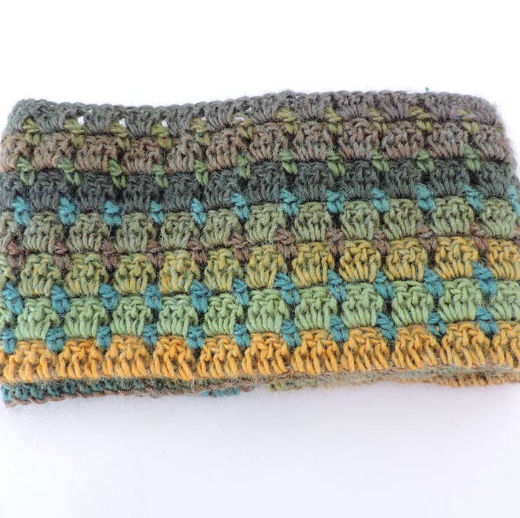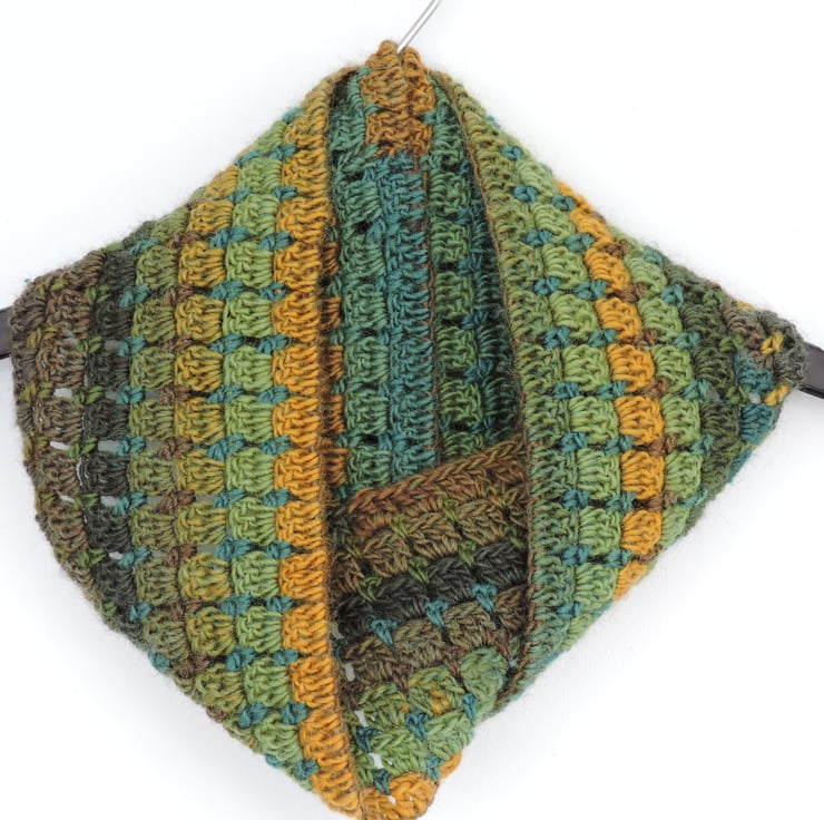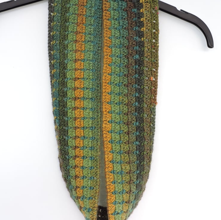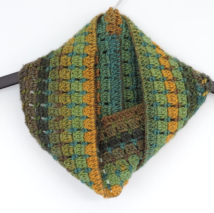 This warm and cosy infinity scarf has been crocheted in a double knit acrylic and wool blend yarn. Lovely multi tonal autumn colours graduating through various greens