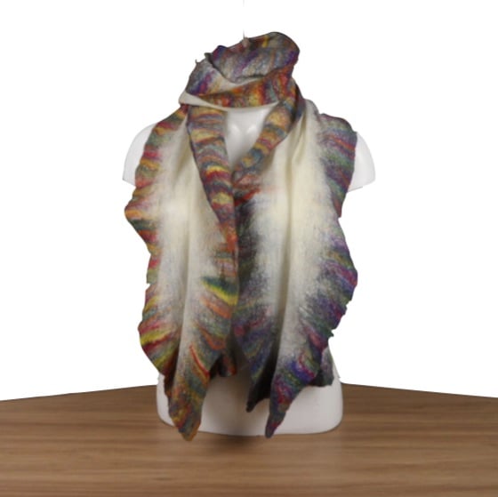 A gorgeous nuno felted scarf in white merino wool with a rainbow coloured border.