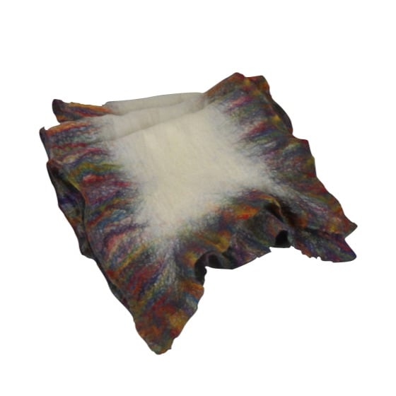 This scarf has been made using a very fine layer of white merino wool nuno felted to both sides of a silk chiffon scarf. A border has been added using a rainbow blend of merino wool laid out so as to create a slightly ruffled border once felted.