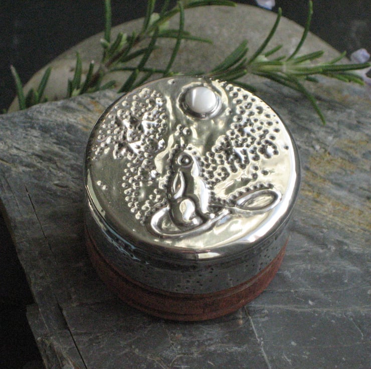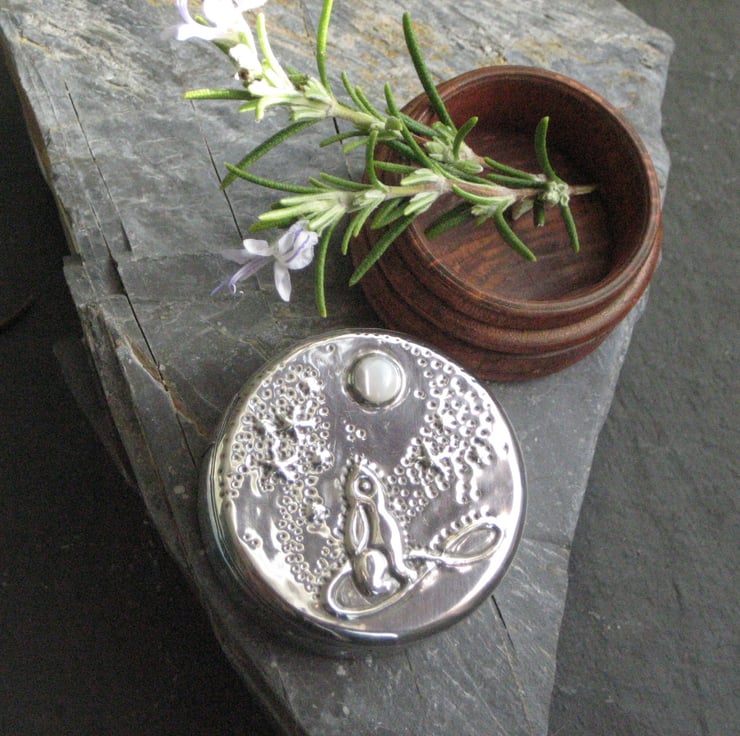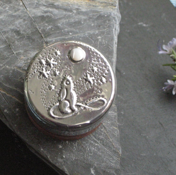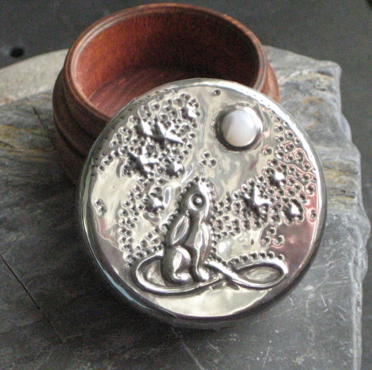 Wooden box with pewter lid, moon-gazing hare design with mother of pearl. The mythical moon-gazing hare depicted in pewter set with a moon of mother of pearl. The lid of this tiny wooden box has been hand-decorated to make a unique present for a man or a woman. The wooden box has been lightly stained. Ideal for keeping safe your little treasures from cufflinks, rings and buttons to hearing aids.