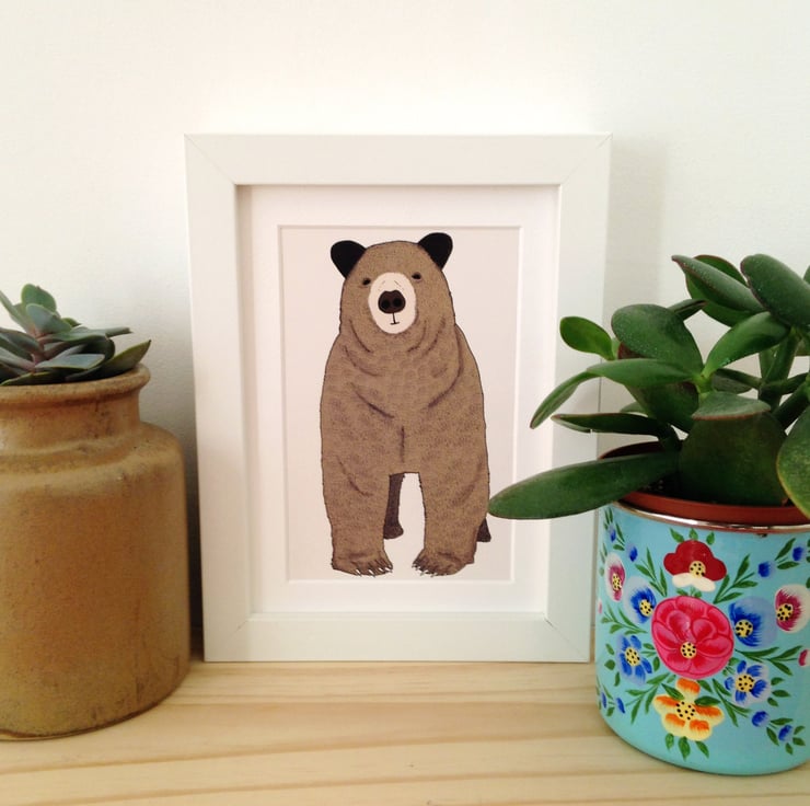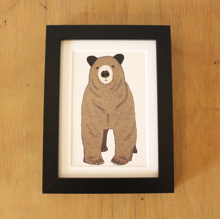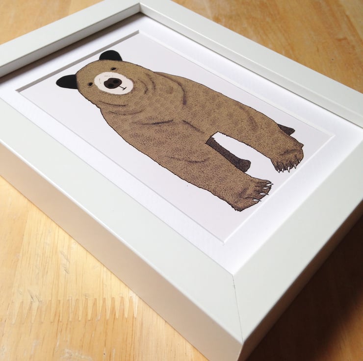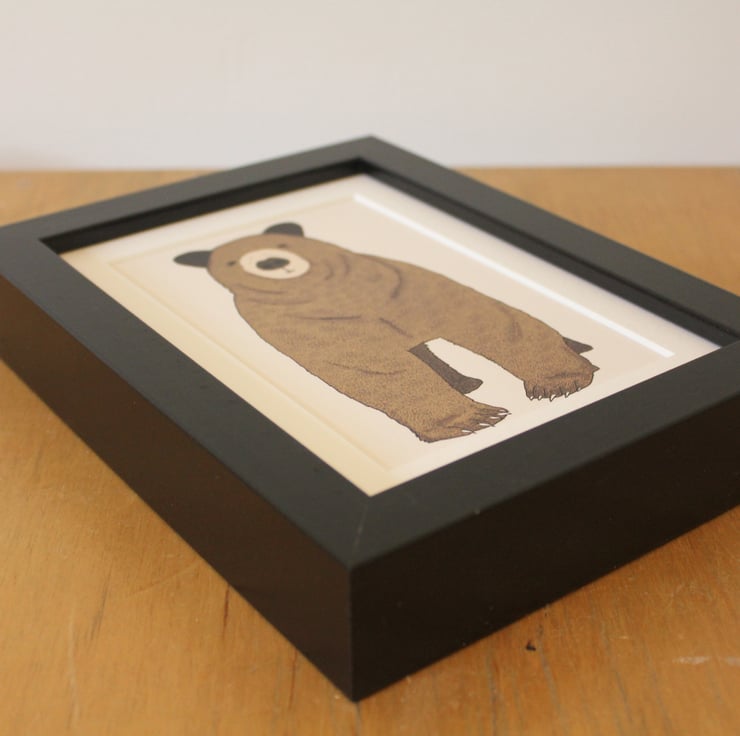 A print of Toby the Bear, an adorable brown bear framed and ready to adorn your walls.