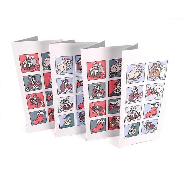 A set of 4 cards (2 red and green, 2 blue), with rats in various Christmassy scenes, including rats stuffing themselves with gingerbread and Christmas pudding, a rat in a santa hat and a rat with reindeer antlers.