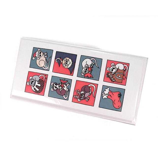 The cards use an original rat design by Kim Onyskiw and are printed on 105mm x 210mm (DL) long cards. The cards are blank inside for your own message and will come with 4 white envelopes.