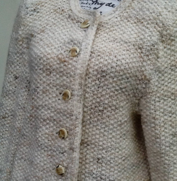 The jacket does not have a collar, but a simple round neck & fastens down the front with six cream buttons into crocheted button holes. The buttons are a prefect match for the jacket, with a swirling marl effect.