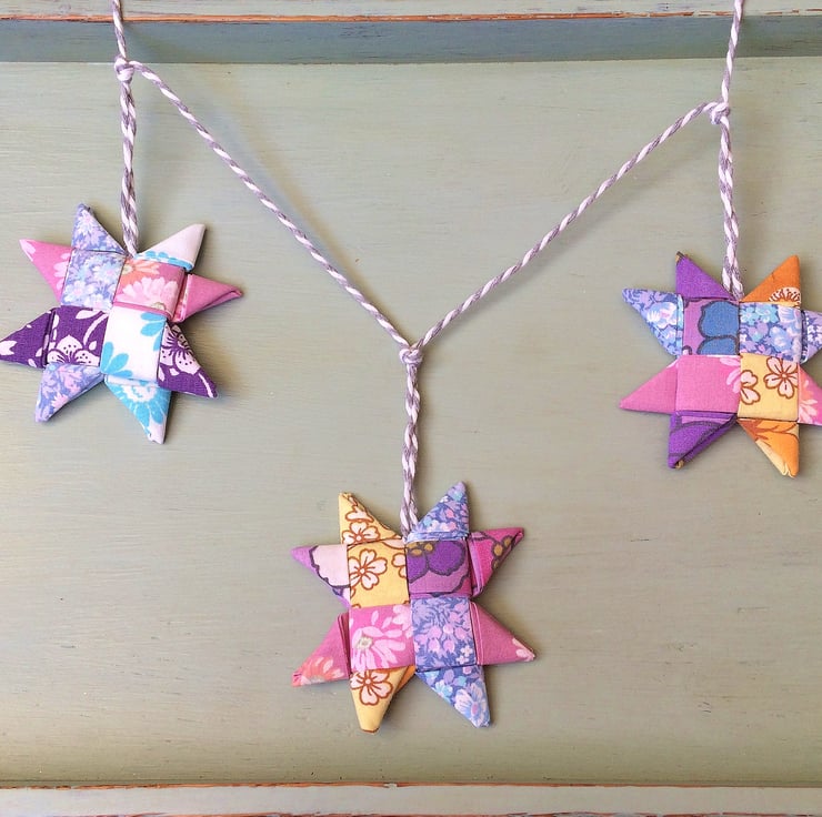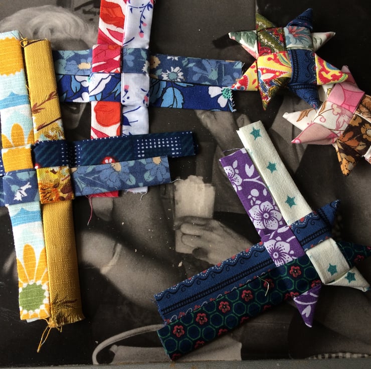 So once unpicked, washed and ironed I have hems which have fold marks - I always like to make the fullest use of the fabrics and these strips of fabrics are great for making these stars. Each start is hand made - see last picture.