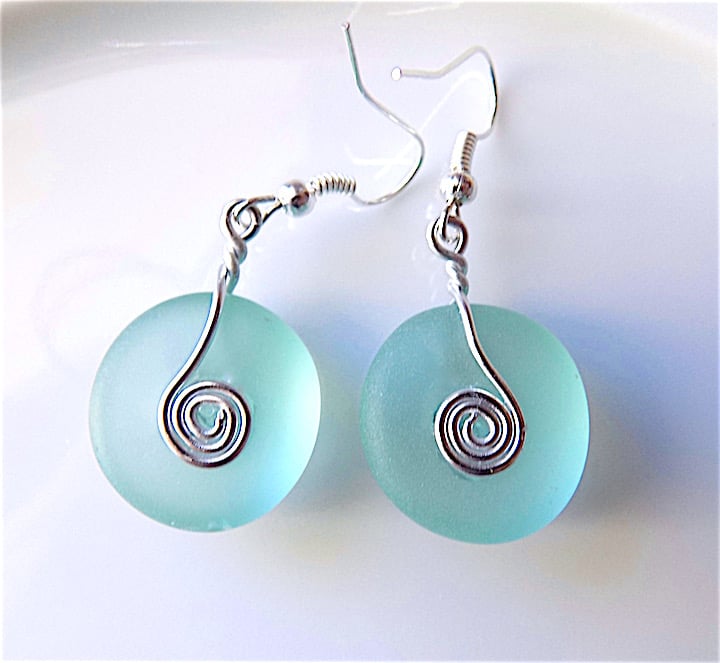 beach found sea glass dangle earrings, sizes including hanging and earwires, length 45 mm ( 4.5 cm ) sea glass 20 X 18 mm, depth of sea glass 8 mm, spiral hanging and ear wires silver plate. I love sea washed glass and spend many happy hours beach combing to find these treasures and to find near matches in shape, colour and size is very difficult, making all these stunning earrings very unique and special. Finished in tumbler for a really smooth silky finish, last image is back view.
