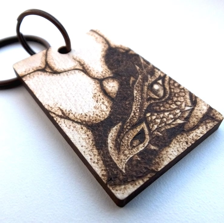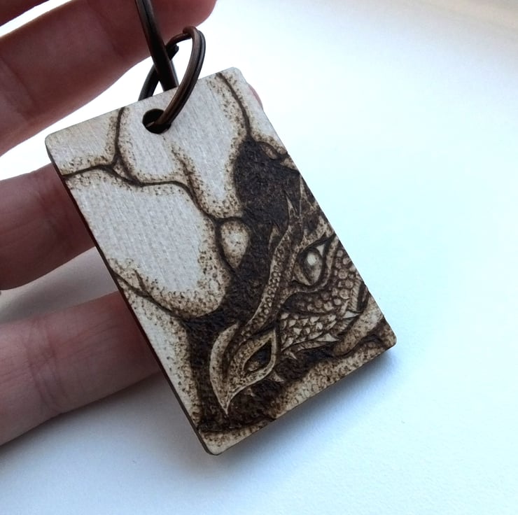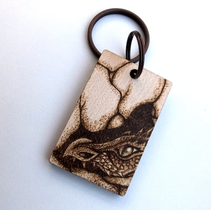 Hand burned fearsome dragon in it's lair, on a rectangular keyring. A mother perhaps, guarding her eggs.