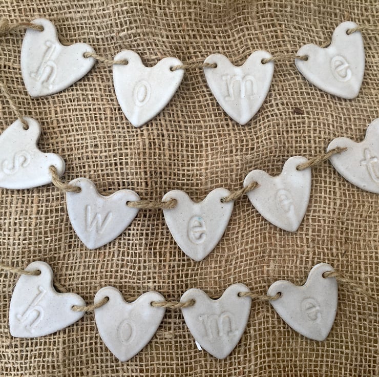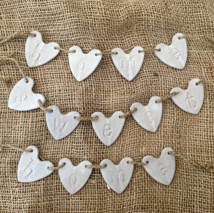 My ceramic Loveheart hanger bunting is handmade as a one off piece of art. This piece is hung using natural brown twine. The Lovehearts are glazed with pure white. I like to refer to these as Ceramic Bunting' The wording is 'Home sweet Home'.