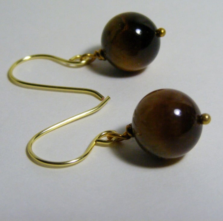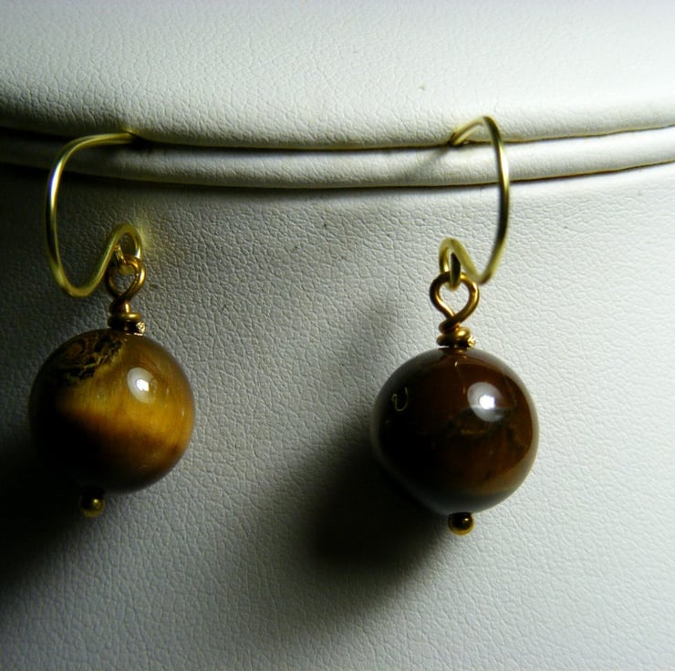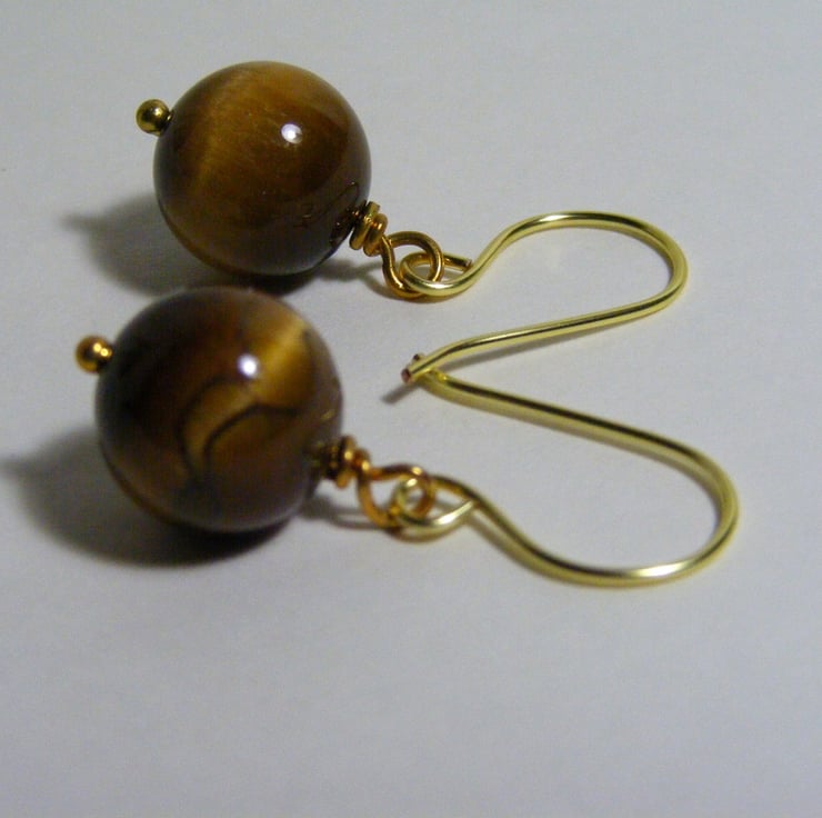 Earrings are made with 12 mm yellow tiger's eye semi precious gemstone rounds which are threaded and wrapped onto gold plated copper ball headpins. Attached ear wires are handmade.