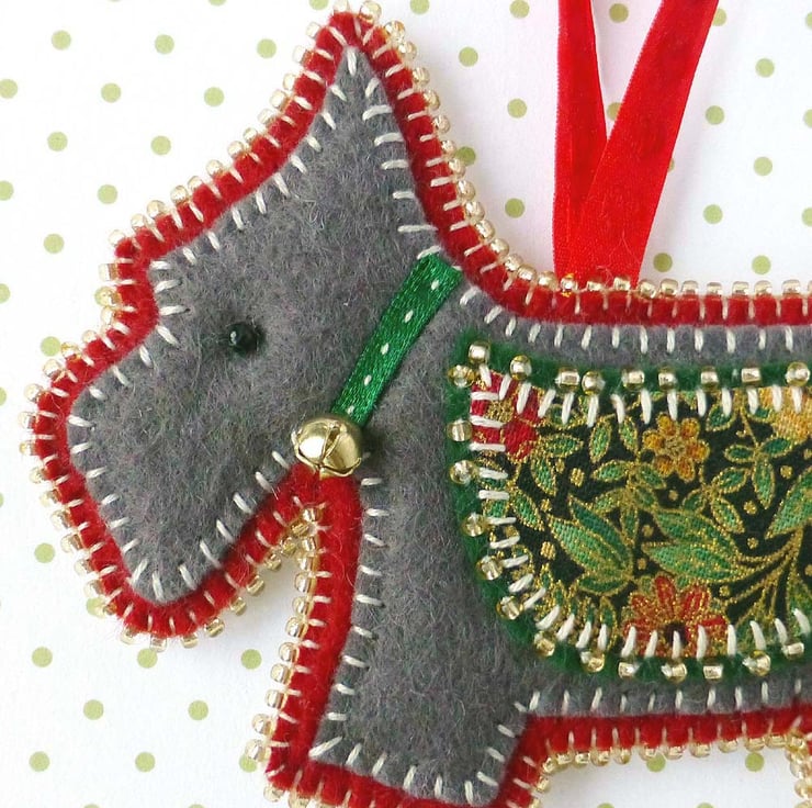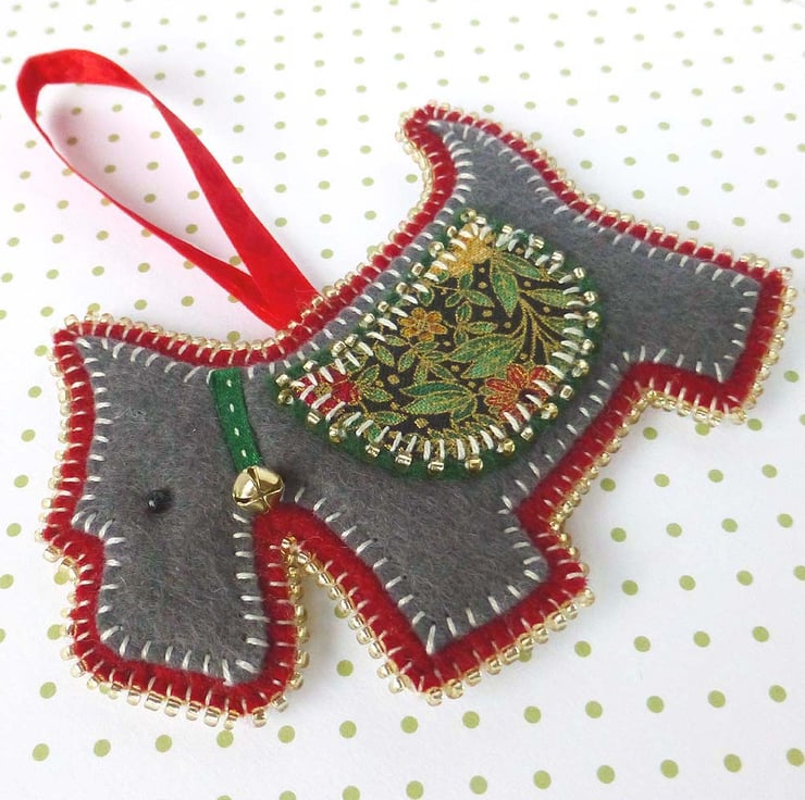 It features a grey felt Scottie which has been appliqued onto a red felt base. It features further applique details in festive floral fabric with gold beading around and has a little green collar with gold bell attached. The decoration is finished with lovely beaded blanket edging with gold beads which catch the light beautifully and a red ribbon hanging loop at the top.